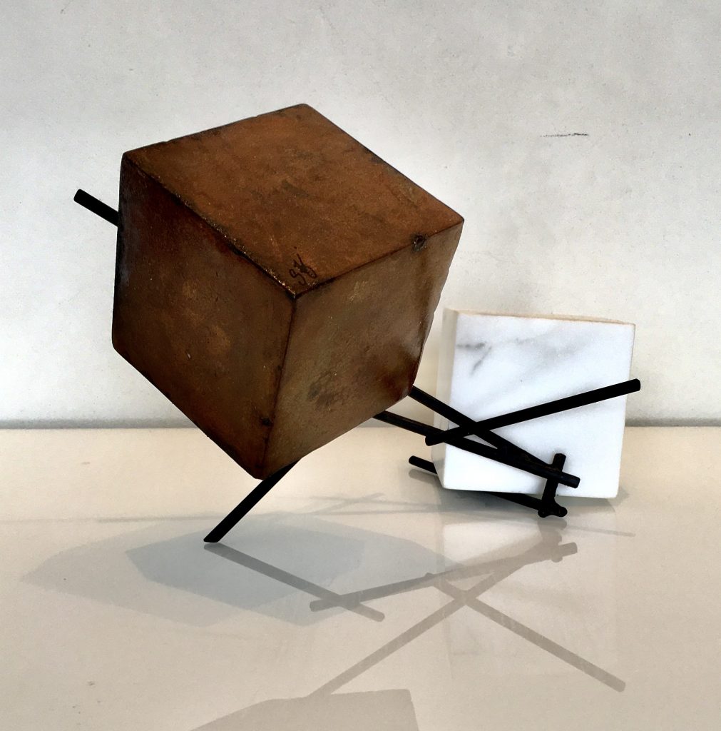 Joute en brun et blanc– 2021 – Dim.: 35 x 18 x 23 cm – acier oxydé, acier peint, marbre de Carrare –